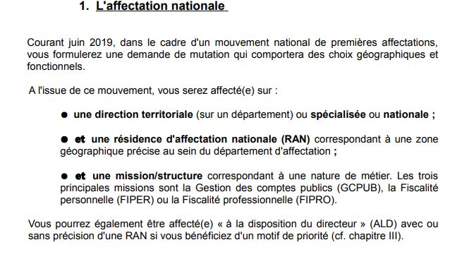 En juin nous allons faire nos vœux pour l'affectations et dans le guide il y a marqué que nous allons indiquer la direction (département), la RAN, et la mission/structure. Dans la mission structure, il y a marqué qu'on devra renseigner soit Gestion des comptes publics, la Fiscalité personnelle ou la fiscalité professionnelle. (tout emploi)