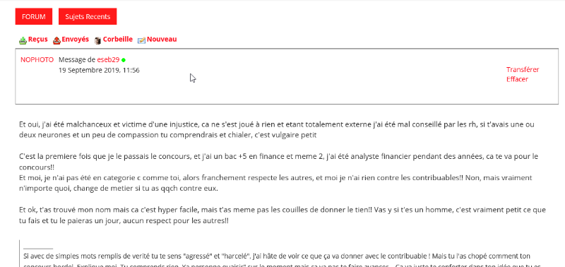 Cette phrase " j'ai un bac +5 en finance et meme 2, j'ai été analyste financier pendant des années, ca te va pour le concours!! je n'ai pas été en categorie c comme toi, alors franchement respecte les autres"