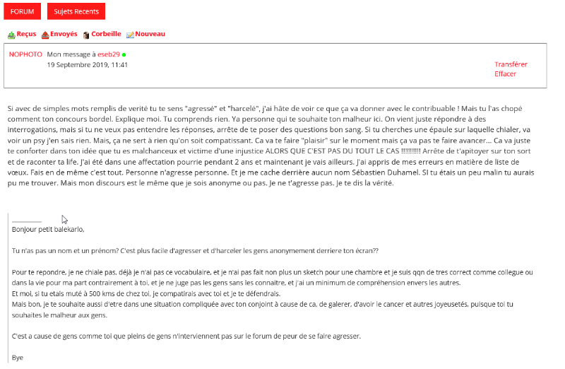 Allez, juste en droit de réponse à tout ces propos diffamatoires, je vous joins la copie écran de la conversation privée (2 messages de eseb et 1 de moi).