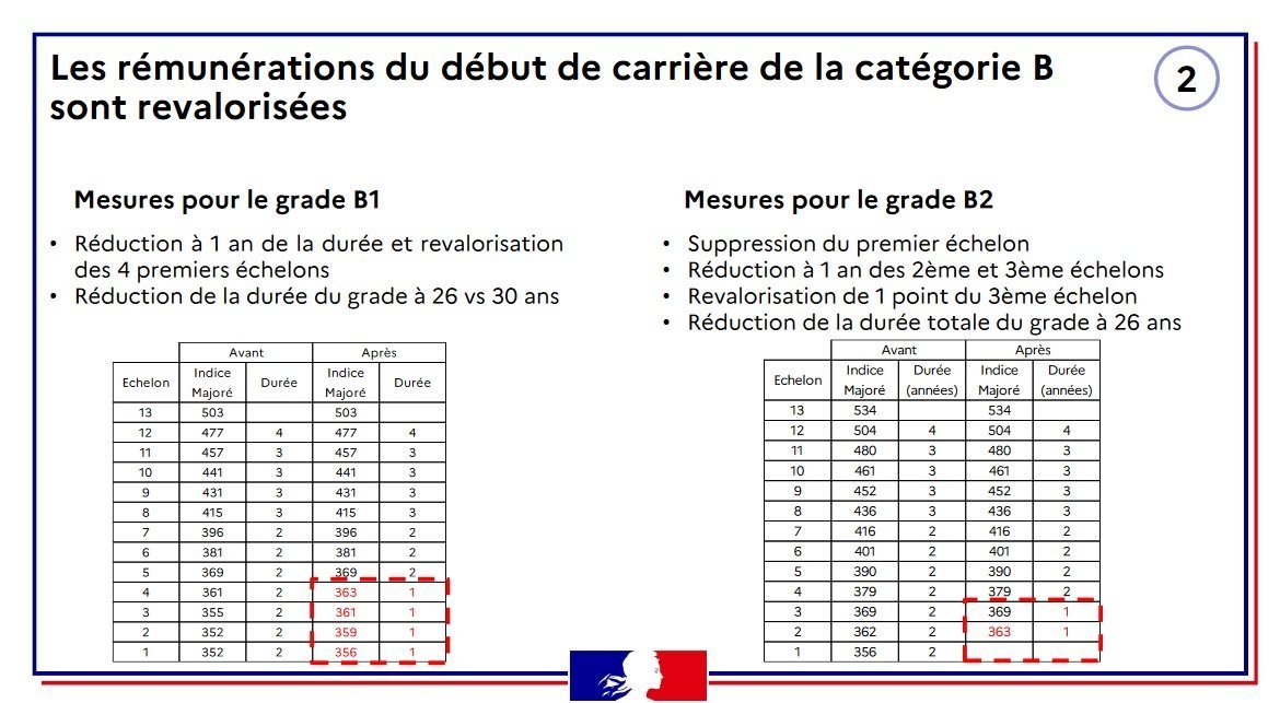 Les premiers échelons de catégorie B vont être revalorisés et la durée passer de 2 à 1ans pour les 4 premiers échelons