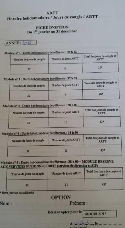 Je suis désolée, je me suis mal exprimée, c'est un formulaire faisant référence aux différents horaires hebdomadaires et au nombre de congés auxquels nous avons droit dans l'année en fonction des horaires choisis