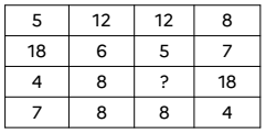 Par contre, le nombre manquant, j'aurais dit 6. Il y a deux 5, deux 4, deux 7, deux 12, deux 18, quatre 8 mais un seul 6. Ils sont par paire. Je sais, c'est tiré par les cheveux mais avec les calculs, je ne vois pas.