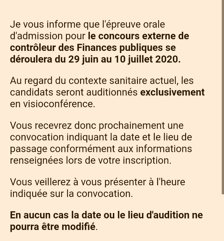 Je vous informe que l'épreuve orale d'admission pour le concours externe de contrôleur des Finances publiques se déroulera du 29 juin au 10 juillet 2020.