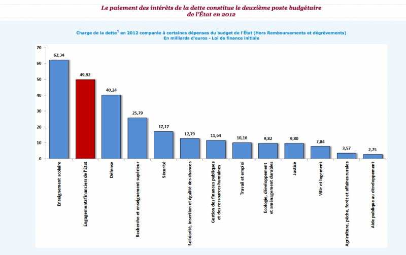 Le projet de loi de finances pour 2013 indique une charge de la dette de 46 895 millions euros et un budget de l'Éducation nationale de 62 755 720 969 euros (à l'euro près !).