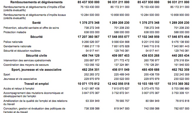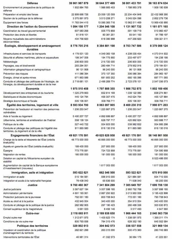 1ère colonne = Ministère / Programme /2ème = Autorisations d’engagement (En €)/ 3ème = Crédits de paiement(En €)