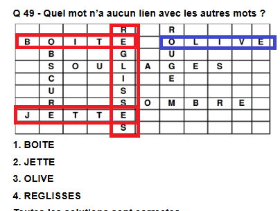 Dans la question 49, je n'ai pas bien compris pourquoi le mot sans rapport était "olive" et pas "jette"